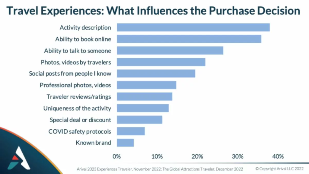 La ricerca di Arival parla chiaro, non è il prezzo o la riconoscibilità del tuo brand che fa la differenza quando un turista internazionale decide di prenotare un’escursione o un’attività in destinazione, bensì le immagini e soprattutto la descrizione del tuo tour!